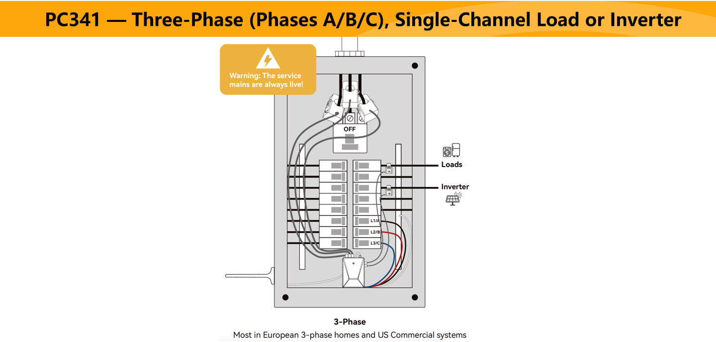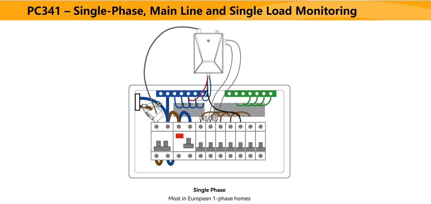 A: In addition to the main line and Phase A/B/C, the PC341 supports monitoring of up to 16 sub-circuits, allowing independent tracking of lighting, outlets, solar inverters, and other loads.